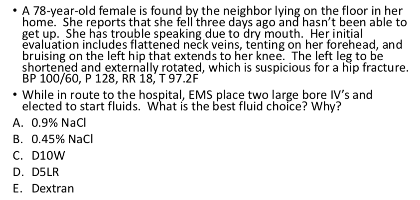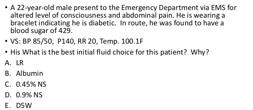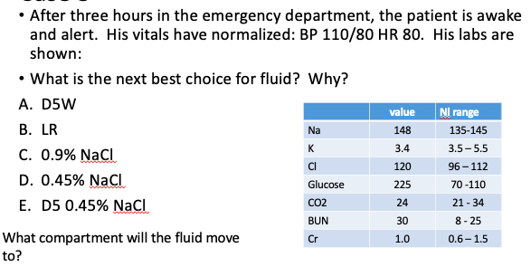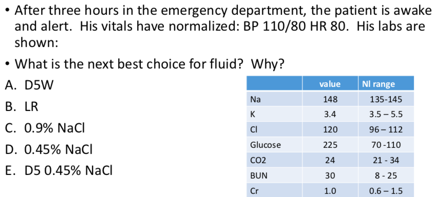 Fluid shift: need to change to hypotonicfluid—the extracellular (intravascular) space has been met. Now fluids will flow into the intracellular space. There is still need for volume expansion (into the cells) but the needs of the vascular space have improved significantly, thus the change to a hypotonic fluid.