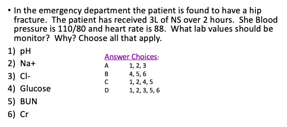 **High volumeNaClcan cause hyperchloremia, hypernatremia and NAGMA therefore the answer is all except glucose. BUN & Cr are important for renal function given that this patient is likely in rhabdomyolysis.