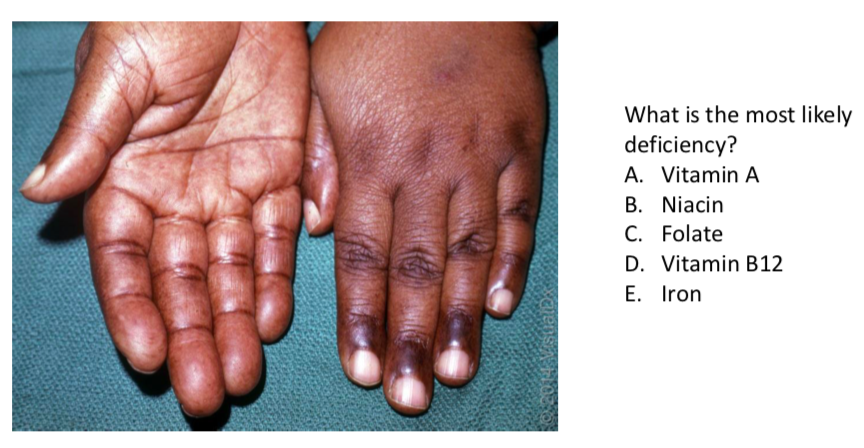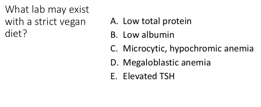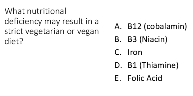 A. B12 (cobalamin) -> no plant source for this; only found in meats