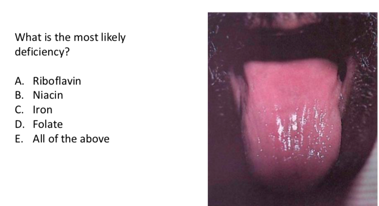 **glossitis occurs with any B vitamin deficiency and Fe deficiency