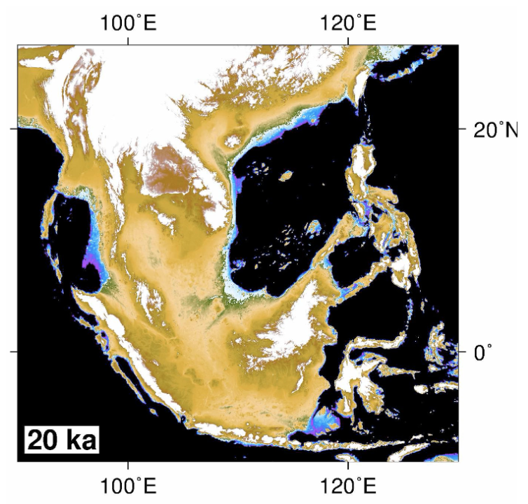 c) Southeast Asia coastline 20,000 years ago depicting the Last Glacial Minimum