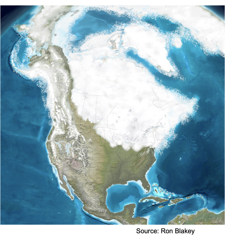 What ice sheet is depicted on this map, and what caused the glaciation?