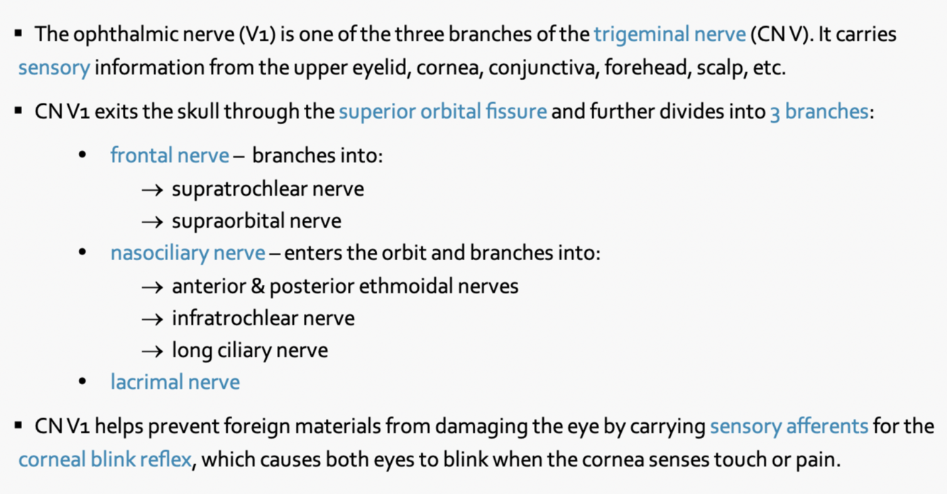 Describe the branches of the opthalmic nerve and the structures it passes through
