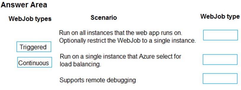 Which WebJob type should you recommend? To answer, drag the appropriate WebJob types to the correct scenarios. Each WebJob type may be used once, more than once, or not at all. You may need to drag the split bar between panes or scroll to view content.