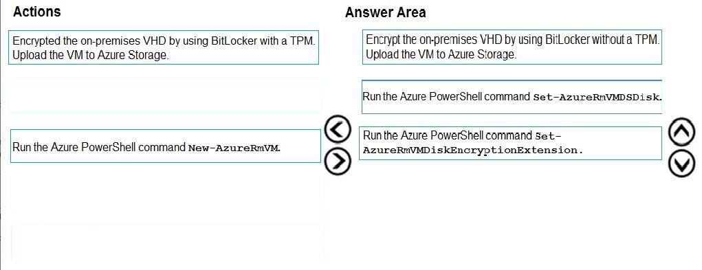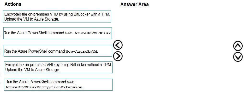 Step 1: Encrypt the on-premises VHD by using BitLocker without a TPM. Upload the VM to Azure Storage