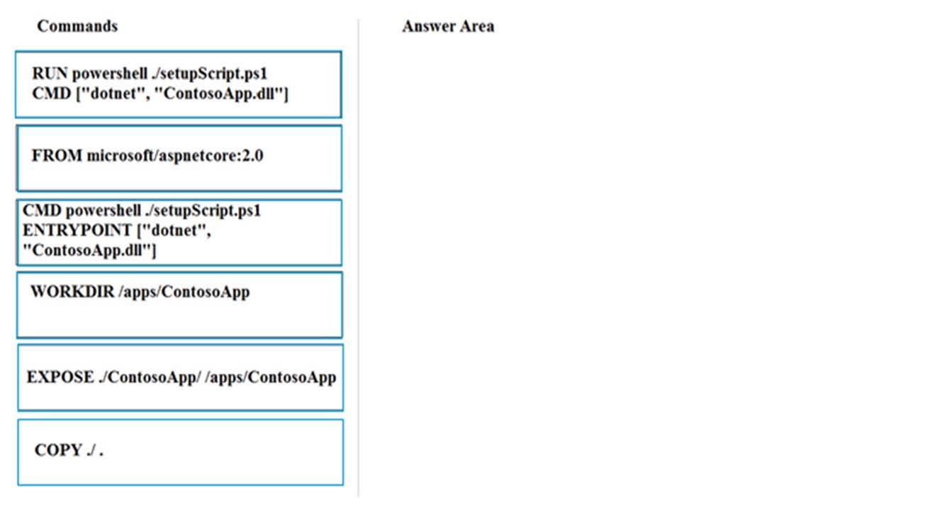 You plan to create a Docker image that runs as ASP.NET Core application named ContosoApp. You have a setup script named setupScript.ps1 and a series of application files including ContosoApp.dll.