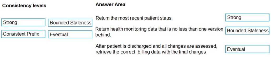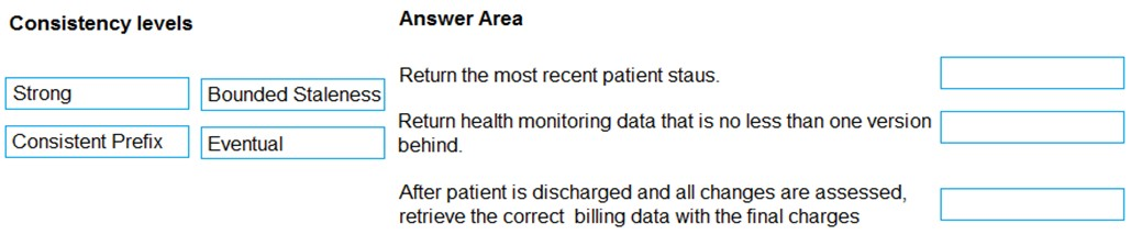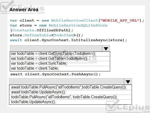 Box 1: var todoTable = client GetSyncTable<todoitem>()<br>To setup offline access, when connecting to your mobile service, use the method GetSyncTable instead of GetTable (example):<br>IMobileServiceSyncTable todoTable = App.MobileService.GetSyncTable(); /<br>Box 2: await todoTable.PullAsync("allTodoItems",todo.Table.CreateQuery());<br>Your app should now use IMobileServiceSyncTable (instead of IMobileServiceTable) for CRUD operations. This will save changes to the local database and also keep a log of the changes. When the app is ready to synchronize its changes with the Mobile Service, use the methods PushAsync and PullAsync (example): await App.MobileService.SyncContext.PushAsync(); await todoTable.PullAsync();<br>References:<br>https://azure.microsoft.com/es-es/blog/offline-sync-for-mobile-services/</todoitem>A company is developing a solution that allows smart refrigerators to send temperature information to a central location.