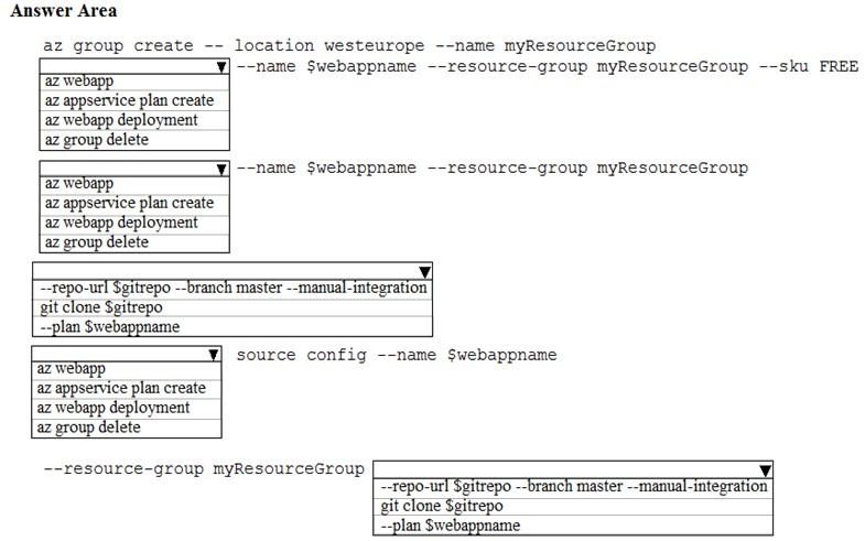 az webapp deployment source config –name firstsamplewebsite1 –resource-group websites–repo-url $gitrepo –branch master –git-token $token