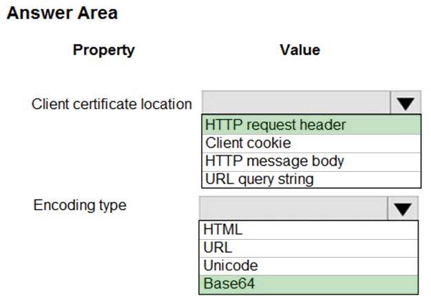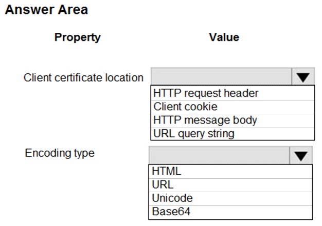 You need to validate the client certificate in the web app. To answer, select the appropriate options in the answer area.