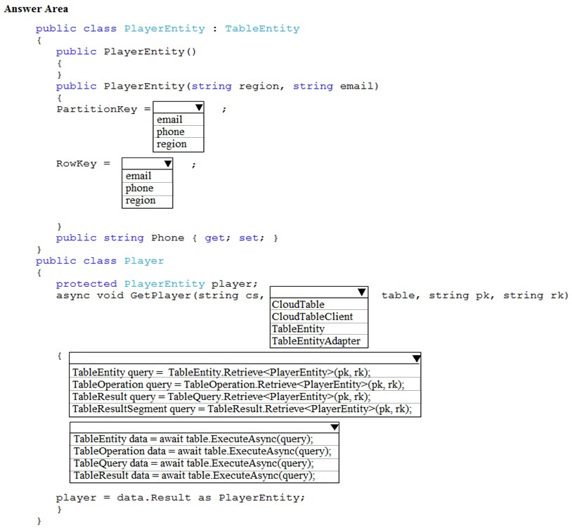 You are developing an app that manages users for a video game. You plan to store the region, email address, and phone number for the player. Some players may not have a phone number. The player’s region will be used to load-balance data.