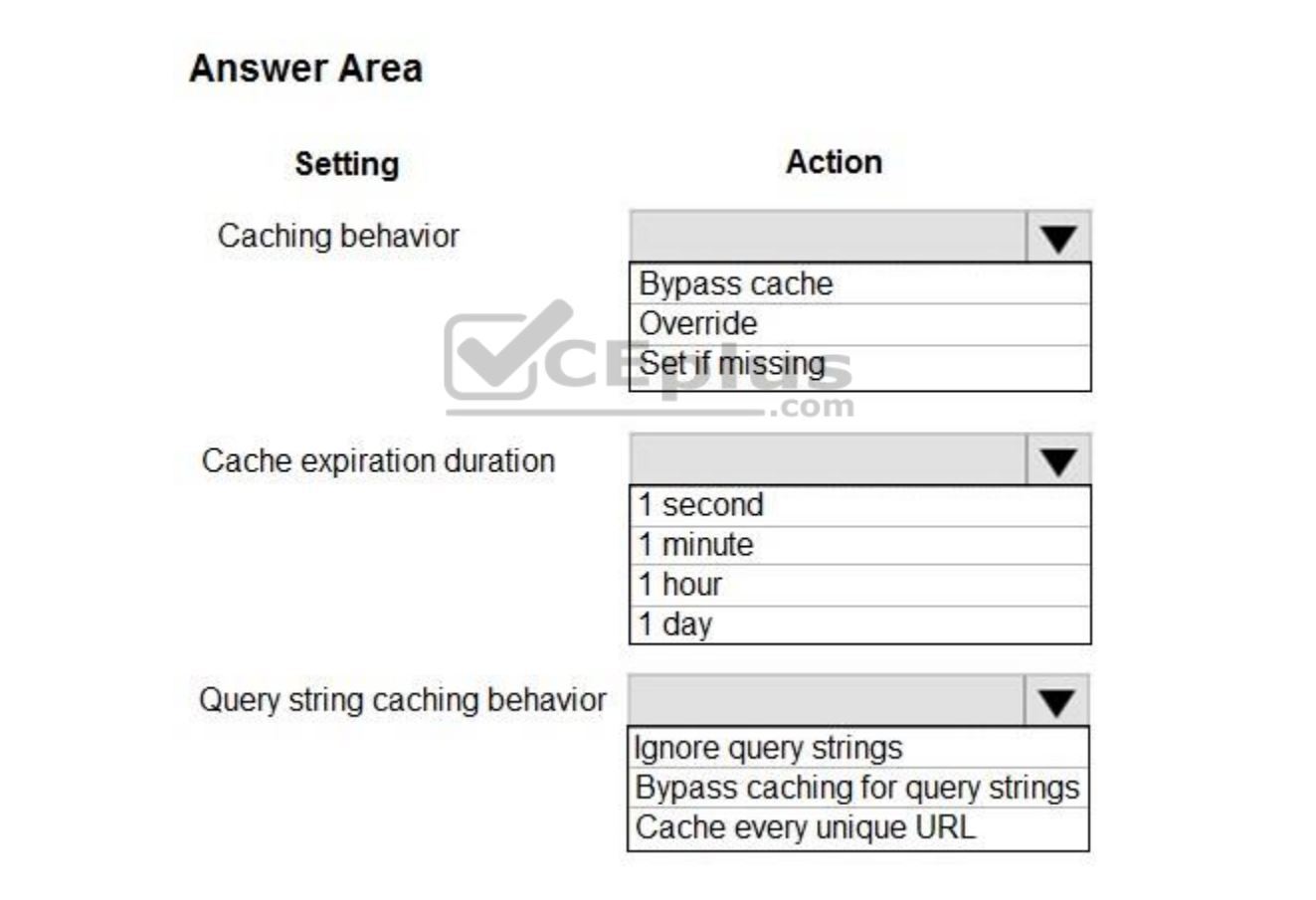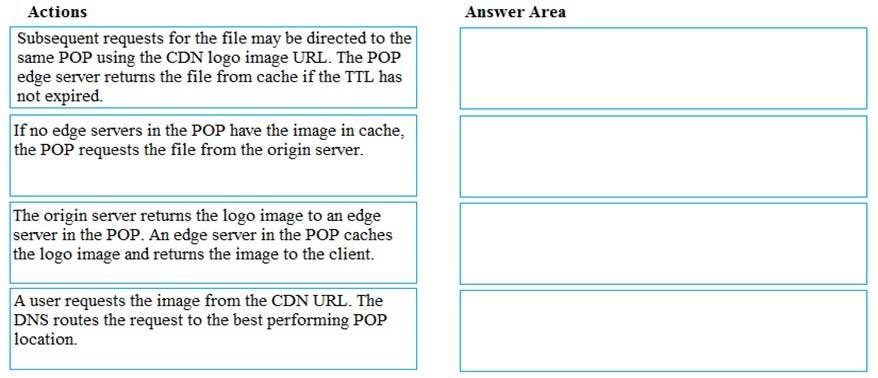 A user requests a file (also called an asset) by using a URL with a special domain name, such as <endpoint>.azureedge.net. This name can be an endpoint hostname or a custom domain. The DNS routes the request to the best performing POP location, which is usually the POP that is geographically closest to the user.<br></br>Step 2: If no edge servers in the POP have the..<br></br>If no edge servers in the POP have the file in their cache, the POP requests the file from the origin server. The origin server can be an Azure Web App, Azure<br></br>Cloud Service, Azure Storage account, or any publicly accessible web server.<br></br>Step 3: The origin server returns the..<br></br>The origin server returns the file to an edge server in the POP.<br></br>An edge server in the POP caches the file and returns the file to the original requestor (Alice). The file remains cached on the edge server in the POP until the time-to-live (TTL) specified by its HTTP headers expires. If the origin server didn't specify a TTL, the default TTL is seven days.<br></br>Step 4: Subsequent requests for..<br></br>Additional users can then request the same file by using the same URL that the original user used, and can also be directed to the same POP.<br></br>If the TTL for the file hasn't expired, the POP edge server returns the file directly from the cache. This process results in a faster, more responsive user experience.<br></br>References:<br></br>https://docs.microsoft.com/en-us/azure/cdn/cdn-overview</endpoint>