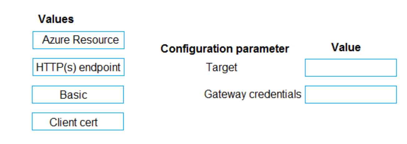 Which target and gateway credential type should you use? To answer, drag the appropriate values to the correct parameters. Each value may be used once, more than once, or not at all. You may need to drag the split bar between panes or scroll to view content.