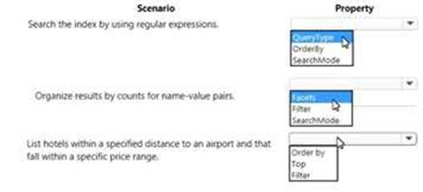 You are developing a .NET Core MVC application for customers to research hotels. The application will use Azure Search. The application will search the index by using various criteria to locate documents related to hotels. The index will include search fields for rate, a list of amenities, and distance to the nearest airport.
