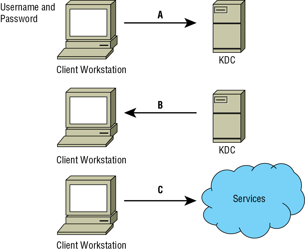 At point A in the diagram, the client sends the username and password to the KDC. How is the username and password protected?