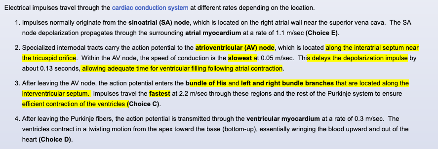purkinje –> atrial mycoytes –> ventricular myocytes –> AV node