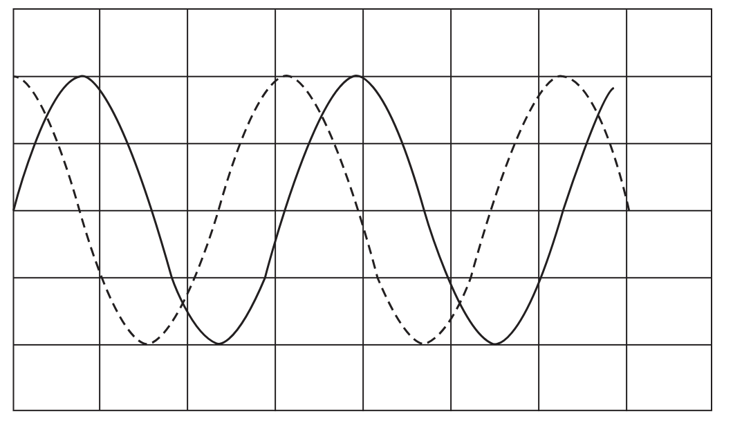 The starting phase of the solid line is 0°, and the starting phase of the broken line is 90°. Therefore, the solid line lags the broken line by 90°.