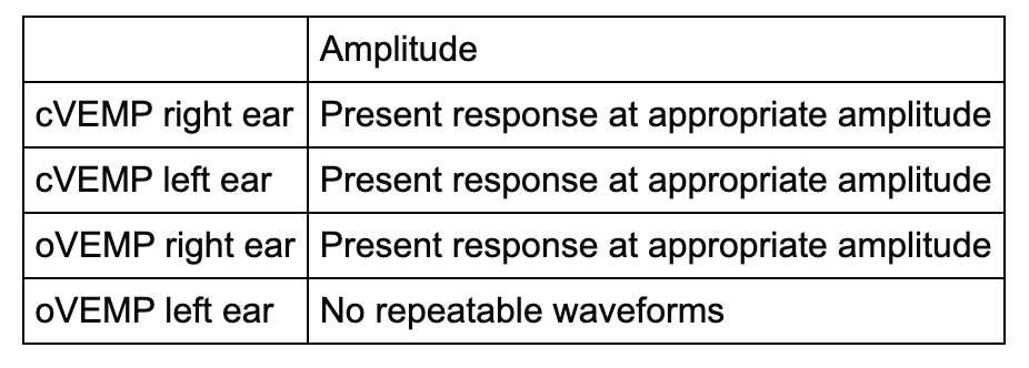 A 42-year-old male is being seen for vestibular testing. He reports that his primary symptoms are feeling off balance and some triggered symptoms of slight dizziness with head movements. Vestibular evoked myogenic potentials (VEMPs) were performed as part of a comprehensive vestibular evaluation. The results of the cervical (cVEMP) and ocular (oVEMP) responses for each ear are summarized in the following table. Testing was performed at 125125 decibels dB SPL at 500 Hz500 hertz for air conduction stimuli. Otoscopy and tympanometry were performed prior to VEMP testing and verified normal outer and middle ear status. Appropriate electromyography (EMG) levels were maintained throughout testing. Which of the following statements best describes the VEMP test results?