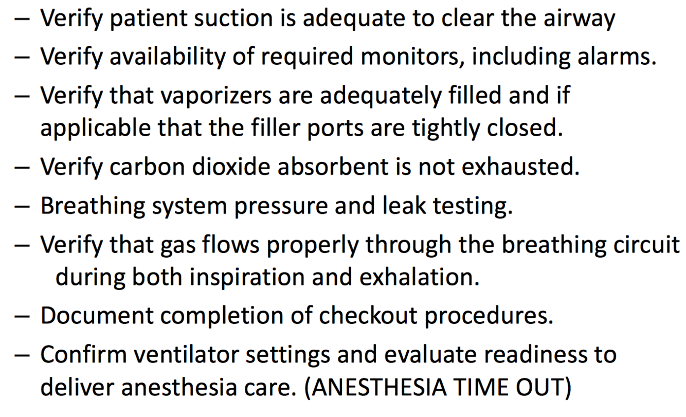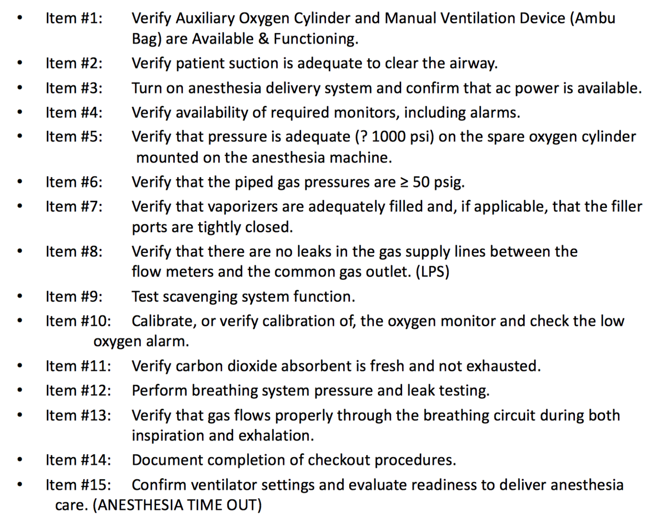 • To avoid patient harm through execution of procedures designed to assure the proper function and presence of critical anesthesia requirements including: