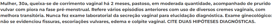 Corrimento pastoso esbranquiçado, coceira que piora no período pré-menstrual, dispareunia, ardor vaginal, melhora transitória com cremes vaginais. Qual o diagnóstico? Tratamento?