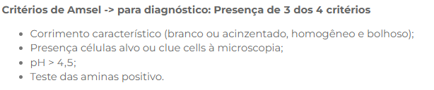 Quais são os critérios de Amsel para diagnóstico de VB?