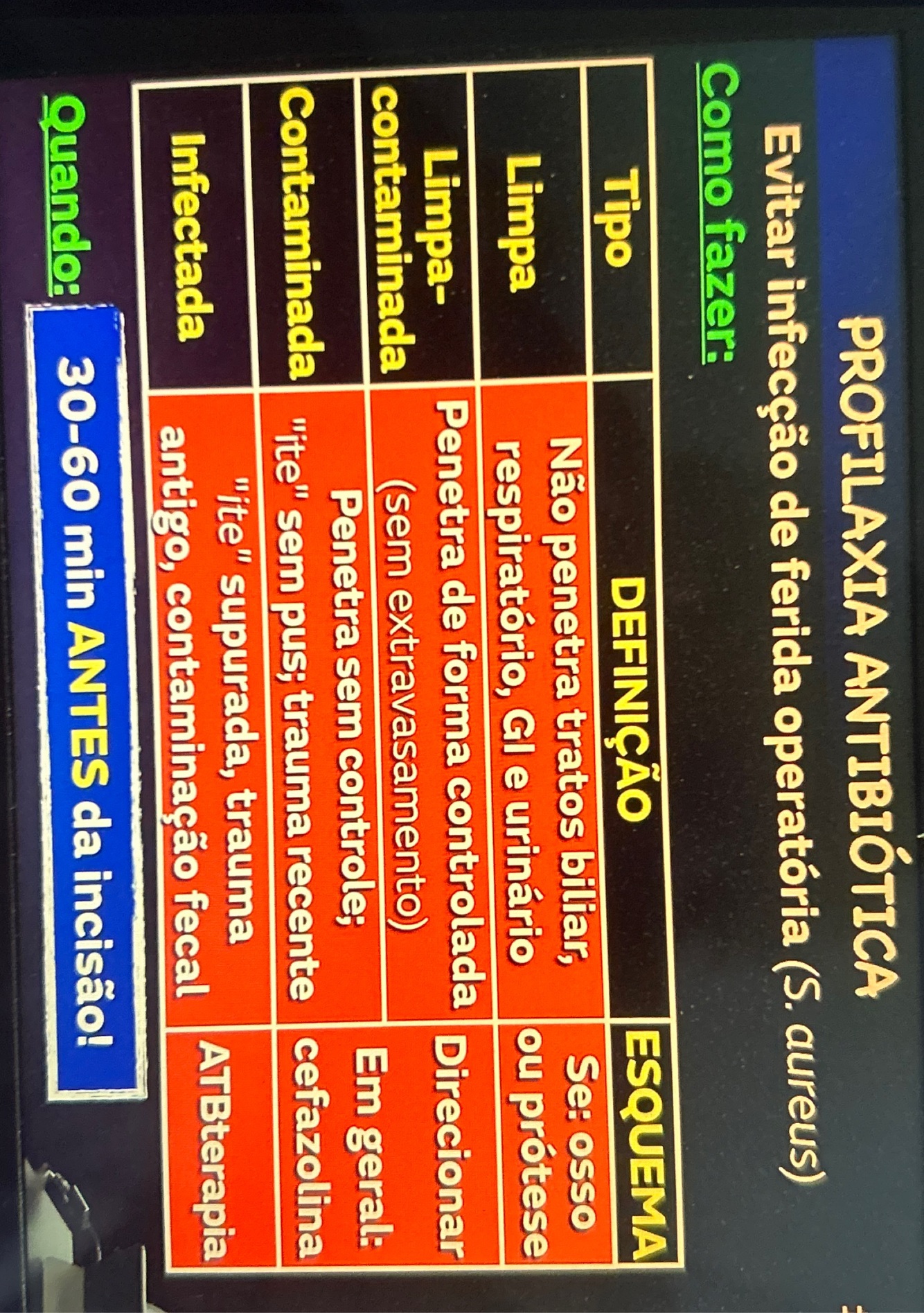 Tipos de contaminacao(limpa,limpa-contaminada…) e atb que tem que fazer