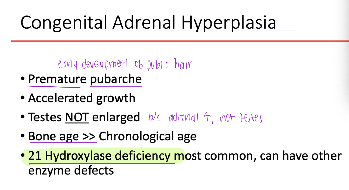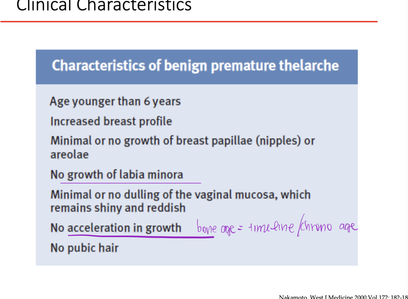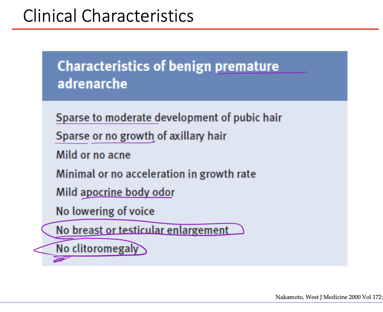premature adrenal androgen secretion – usually due to pubic hair , NO CLITOROMEGALY OR breast enlargement