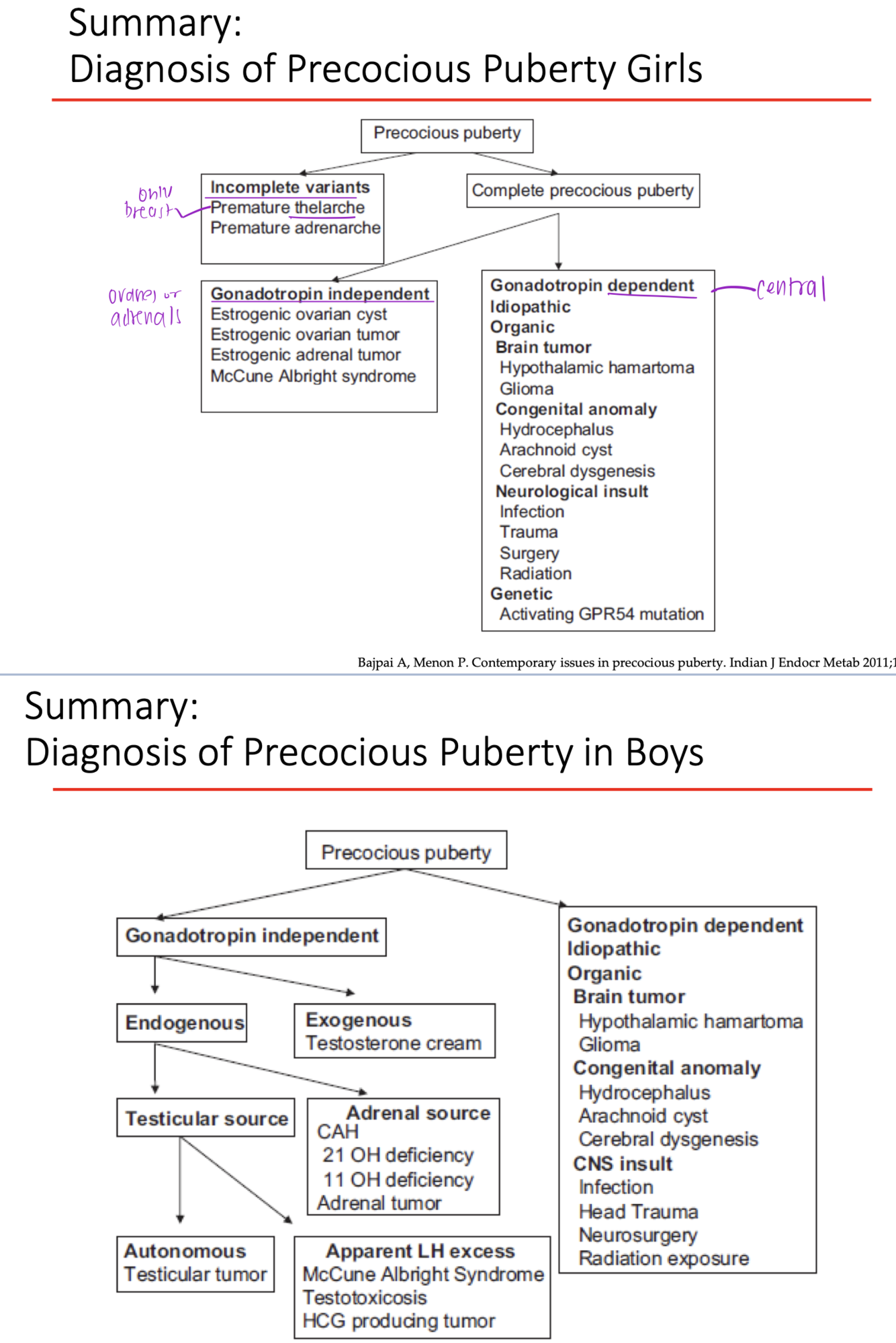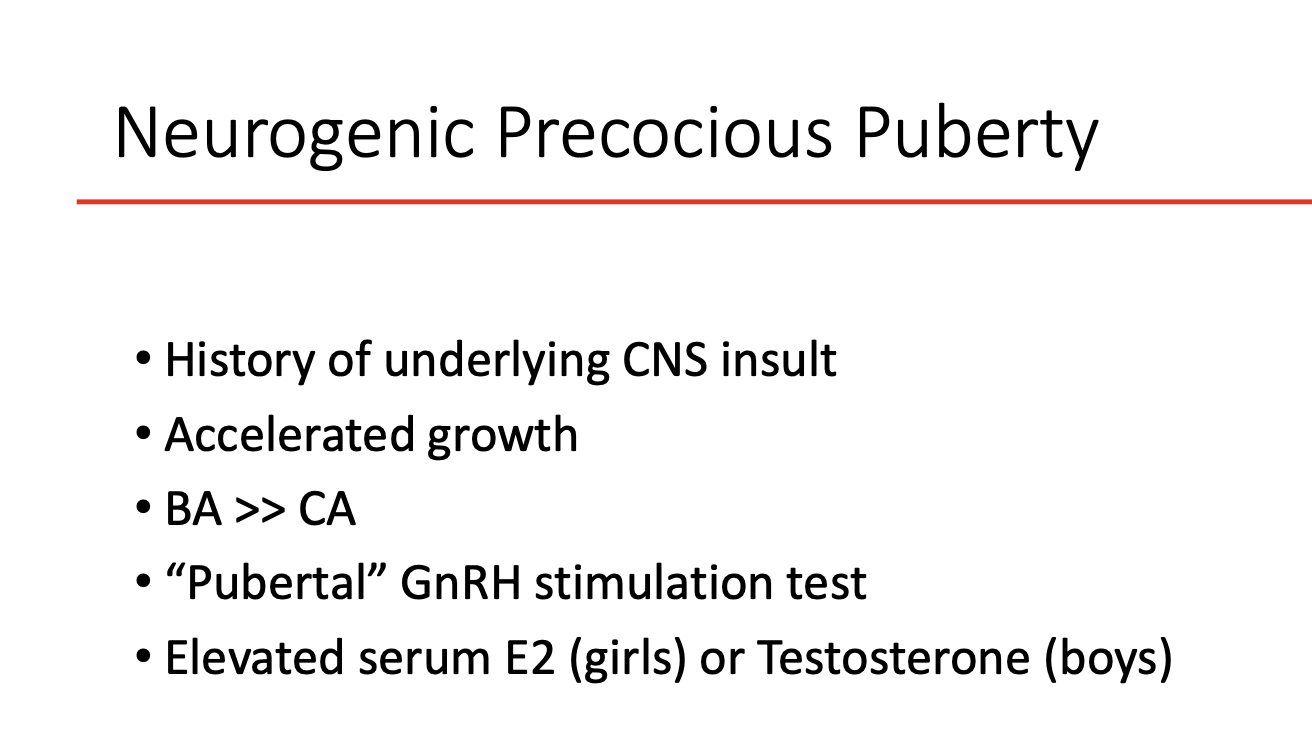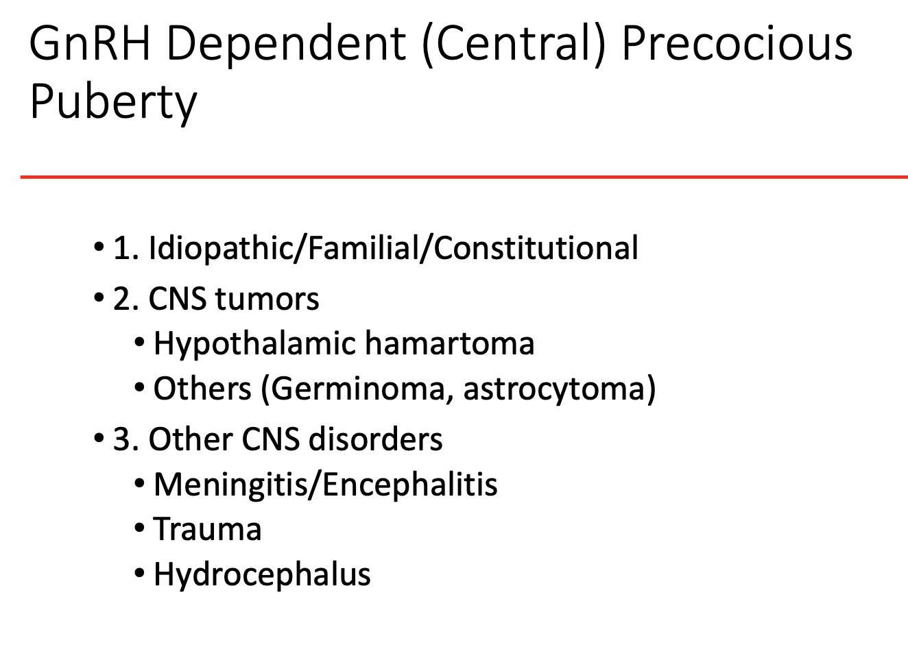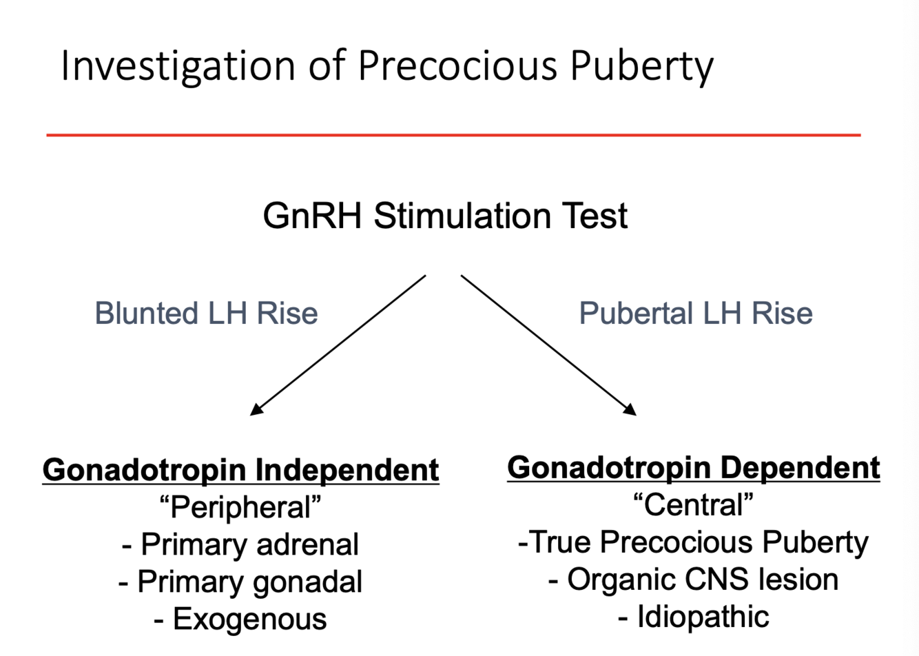 significant LH rise: it is a central issue. it is gonadotropin dependent and a sign of “true precocious puberty”– it could be due to an organic CNS lesion or idiopathic