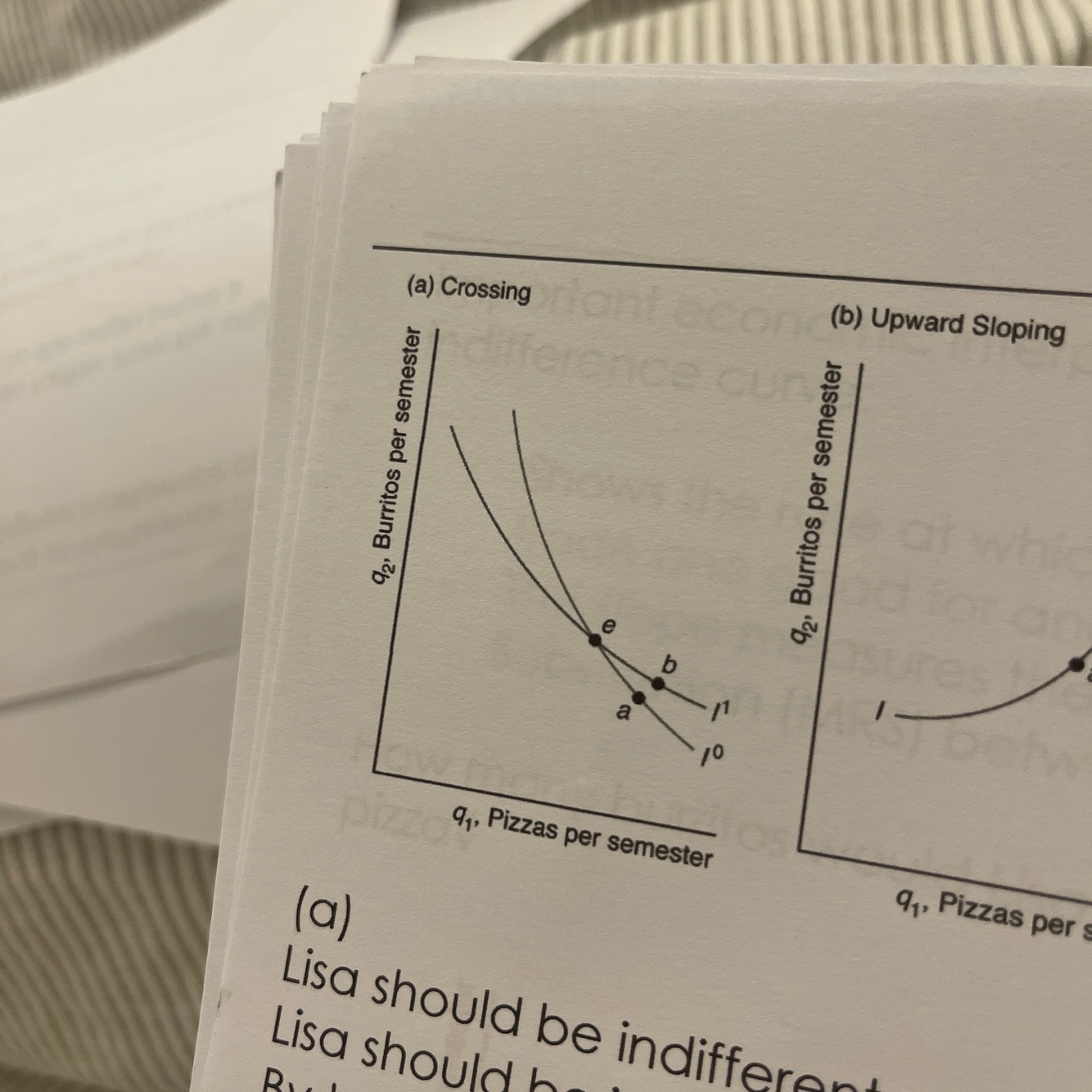 Because according to the curves, Lisa should be indifferent about e&a and e&b so by transivity if Lisa is indifferent about both of those, she should be indifferent about a&b but due to the non satiation principle this cannot be possible.