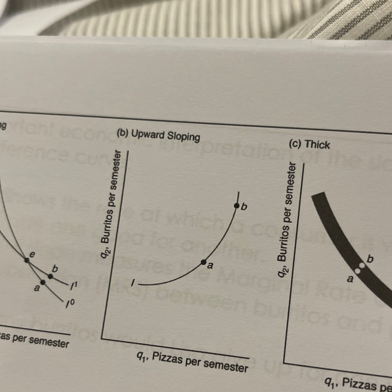 It would tell us that the consumer is indifferent about a&b as they both lie on the same curve but by non-satiation the consumer would prefer b to a as it is higher and to the right. They contravene our assumptions thus cannot be upward sloping.