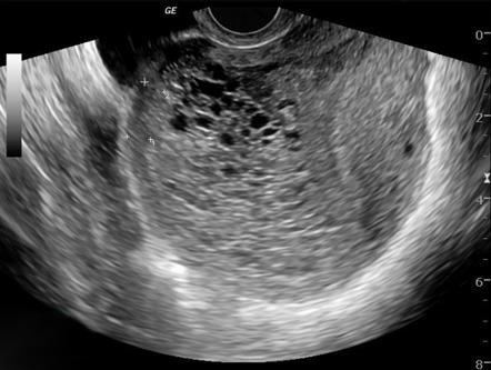 Appears as snowstorm on USS, with hydropic villi + large theca lutein cysts