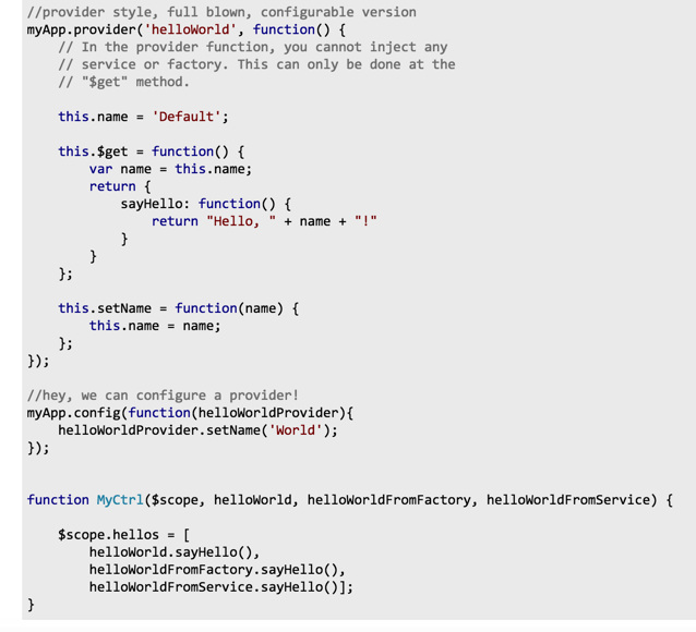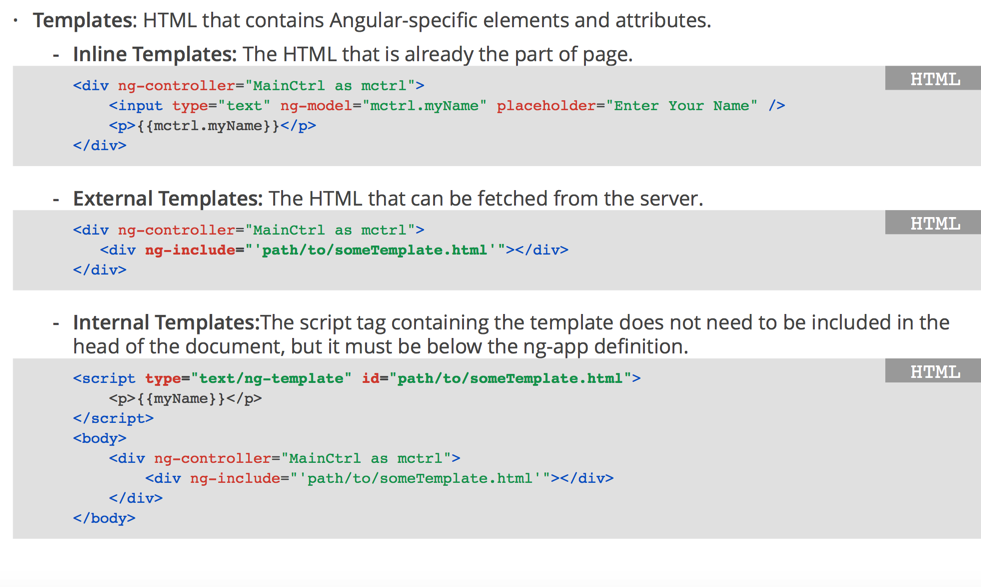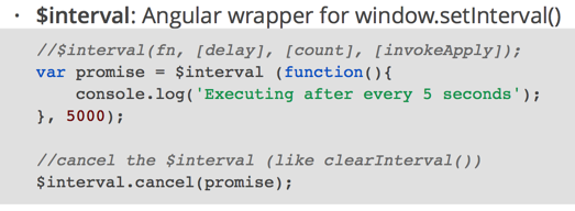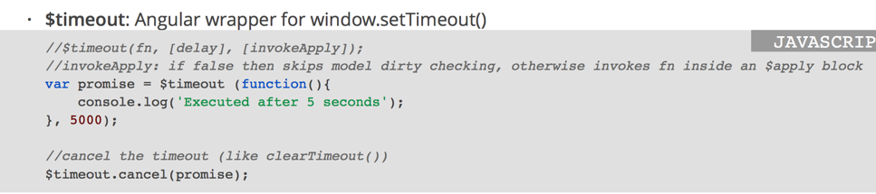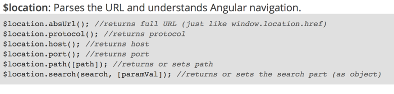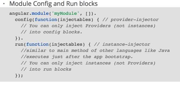 · Angular has many in-built services (starting with $) e.g. $rootScope, $http, $routeProviders etc.
