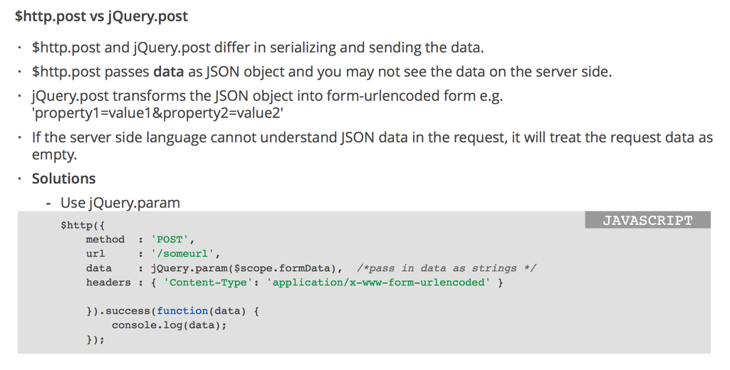 http service - we make async rqst to server; using ‘get’ method for example - we can get or fetch json data from the server; this request returns a promise object with .success() and .error(); if we tell $http to fetch json , the result will be automatically be decoded into JS objects and arrays; $http returns a promise, so success() gets the data …