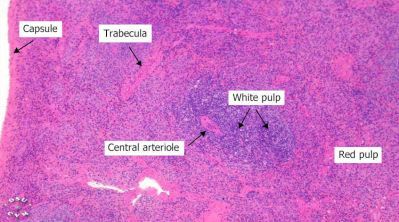 Vit pulpa med tätt packade lymfocyter och centralartär