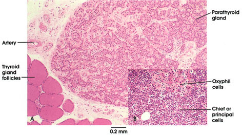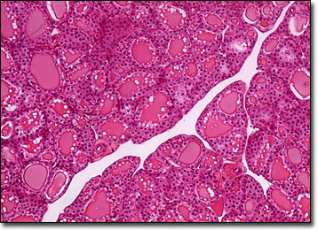 Oxyfila celler – ligger i små grupper eller utspridda, större, röd granula