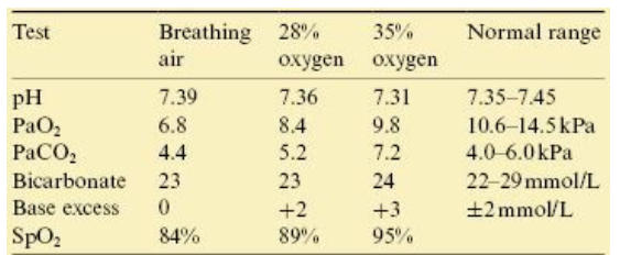General She is short of breath at rest. Obs T 36°C, HR 80 beats/min, BP 118/64 mmHg, RR 26 breaths/min, SpO2 95% breathing 35% oxygen via Venturi mask.