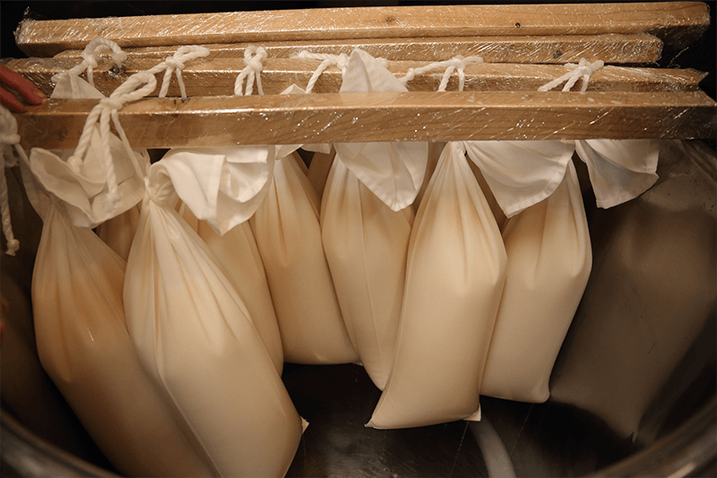 The mash is put into 6 litre cloth bags and hung from a pole. The sake is allowed to drip out under its own weight into 18-litre glass bottles called Tobin.