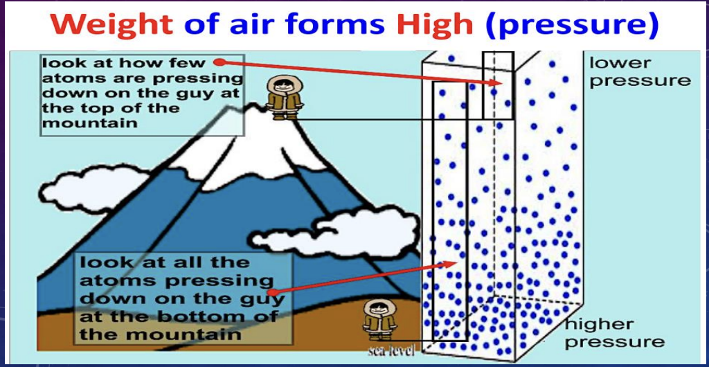 Air pressure decreases with altitude, so the bottom of a mountain has higher pressure than the top.