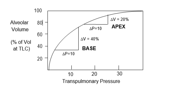 The apex of the lung is at a […] negative pleural pressure and its alveoli are at a […] volume. Thus, alveoli at the apex are […] compliant.