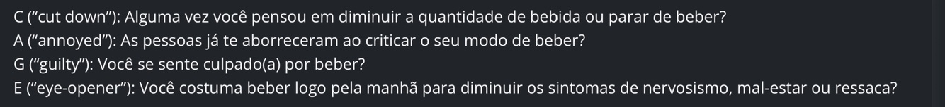 Apresente o questionario CAGE na investigação do etilismo