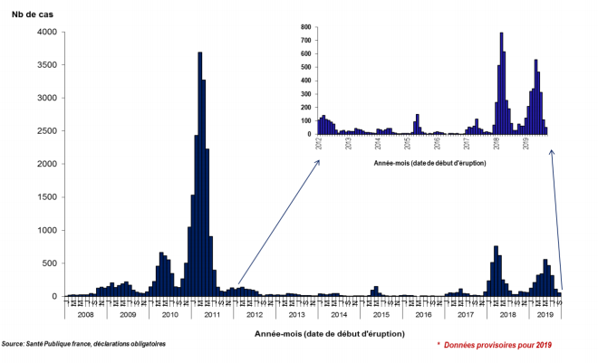 A quoi sont alors dus les différents pics du nombre de cas de 2008 à 2019 ?