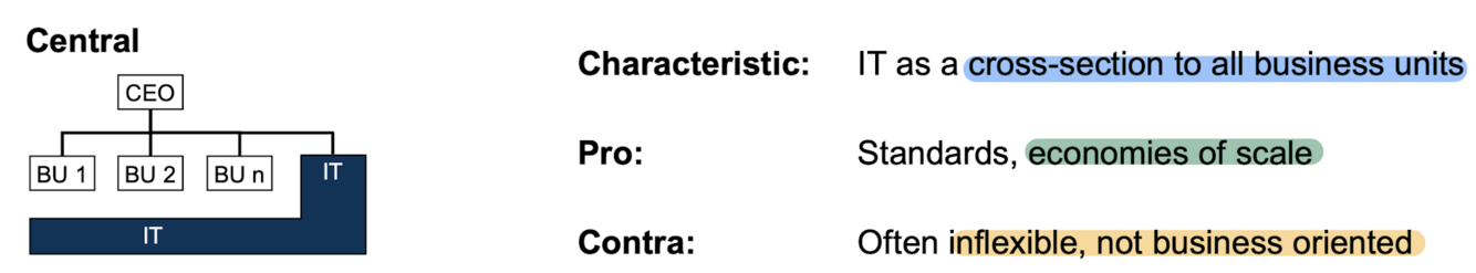 Draw the central IT organization and provide its characteristics. Name one pro and con.