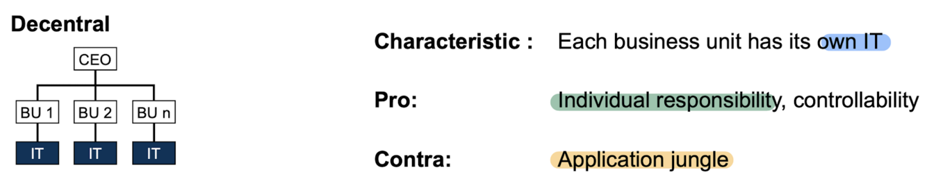 It is a decentral IT organization. The characteristic is that each business unit has its own IT. Pros are individual responsibility, and controllability. Contra is the application jungle.