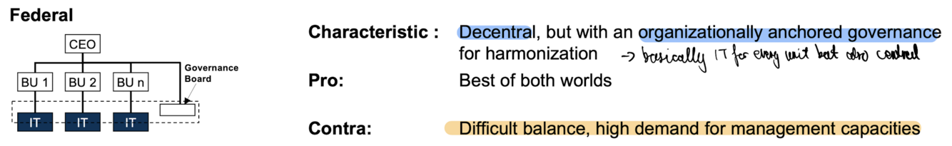 Draw the federal IT organization and provide its characteristics. Name one pro and con.