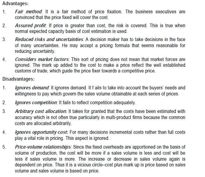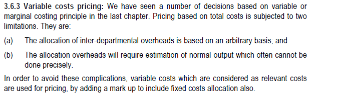 Variable cost pricing - Due to limitations of total cost method like Allocation of inter-departmental overheads is arbitrary;estimation of normal output can npt be done precisely