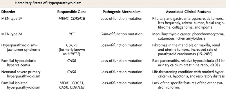 Familial syndromes (MEN 1 & 2a), Familial isolated hyperparathyroidism (FIHPT).