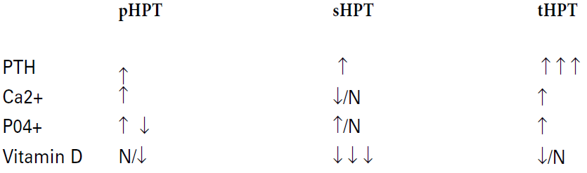 Diagnostic : ↑ Ca2+ (corrected for albumin or ionized (≥2.6 mmol/L)), ↑ iPTH, ↓ or normal PO4