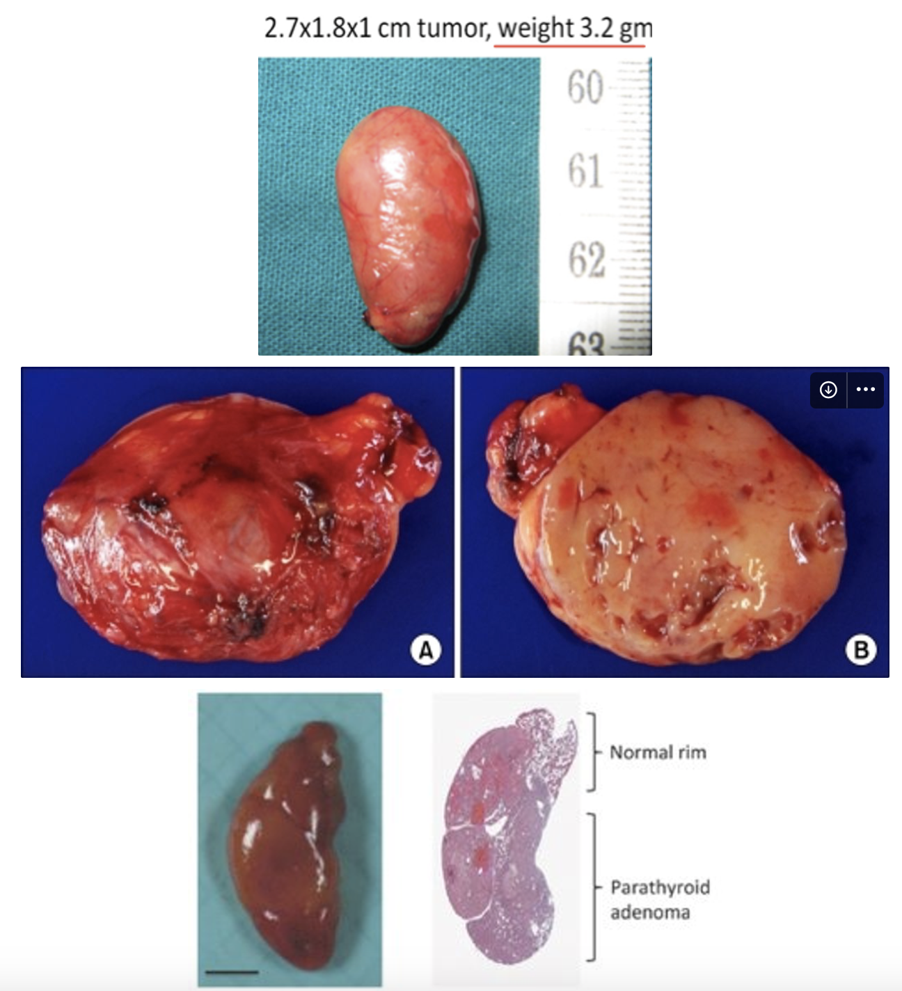 Parathyroid carcinoma (<1%) - Not capsulated, lobulated, firm with adhesion.