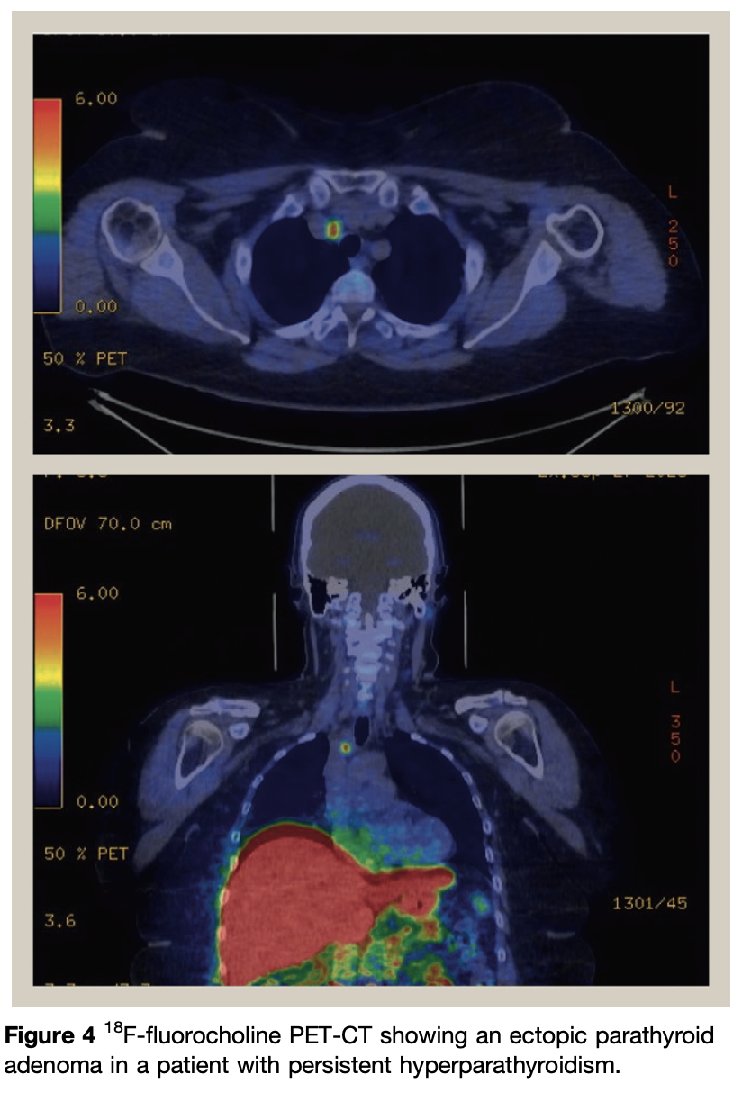 Several articles have reported the high sensitivity of 18F-fluorocholine PET-CT for the detection of parathyroid adenomas. Choline PET-CT can detect elusive parathyroids, including ectopic glands, and may be considered in the management of persistent or recurrent disease when other scans are negative