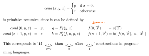 Given n disjoint primitive recursive conditions ( = predicates), A1, …, An and n primitive recursive functions h1, …, h2 define following P.R. function: