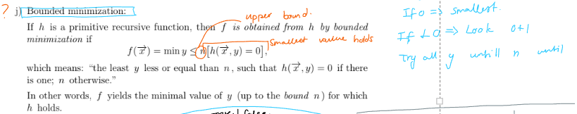 “the least y less or equal than n, such that h(x, y) = 0 if there is on; n otherwise”